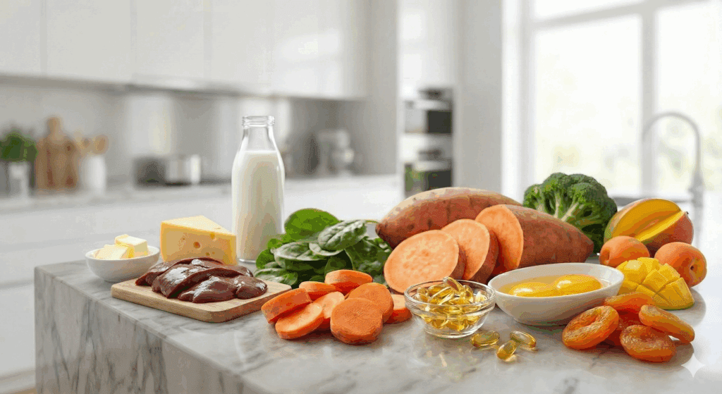 A vitamini, hayvansal kaynaklarda “retinol” formunda; bitkisel kaynaklarda ise “beta-karoten” formunda bulunur. Karaciğer, yumurta sarısı ve süt ürünleri hayvansal kaynaklara örnektir. Havuç, tatlı patates, ıspanak, brokoli ve koyu yeşil yapraklı sebzeler ise beta-karoten açısından zengin bitkisel kaynaklardır.
